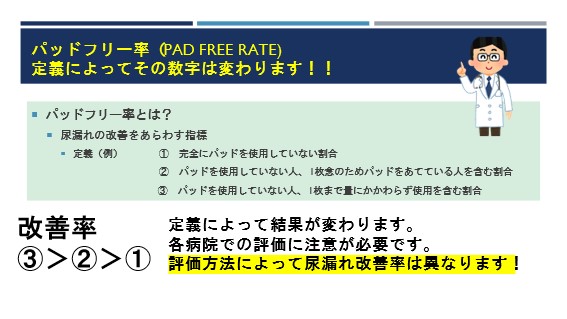 例えば、尿失禁改善が術後3か月で70%です。といっても全くパッドを使用していないのか、念のためパッドを1枚あてているものを含めるのか、パッド1枚まで漏れている量に関係なく許容して含んでいるのかで評価が変わってきます。