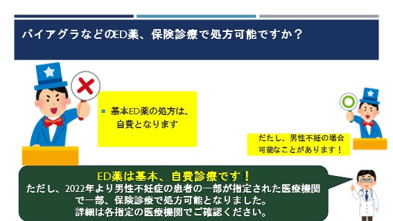 患者さんがパートナーと妊活に取り組んでおりかつ、勃起不全が不妊の原因となっていることが確認できないとED薬は保険適用とはならないと思われますのでご注意ください。