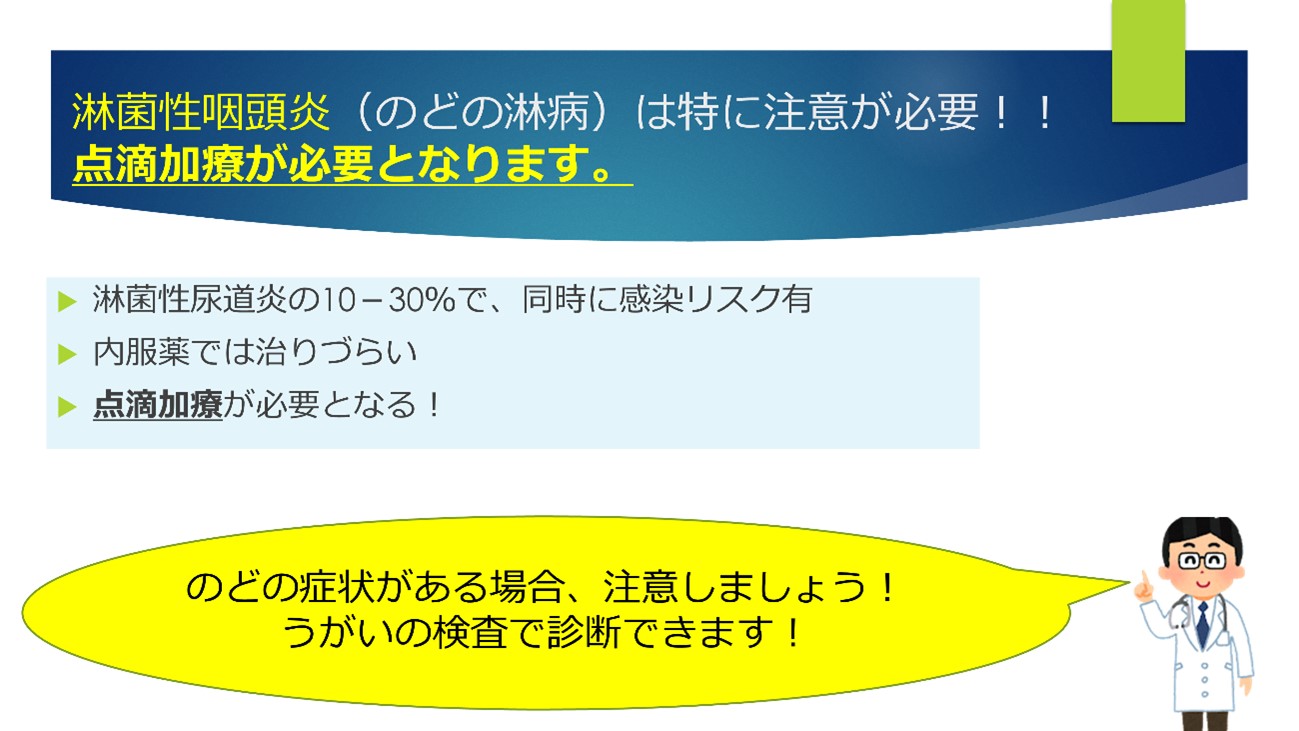 淋菌性尿道炎・膣炎でのどの症状がある患者さんは注意が必要です。
