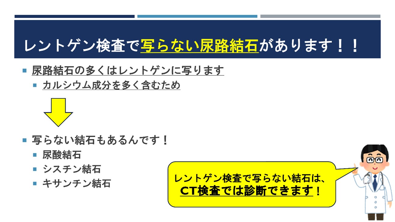 答えは×で、すべての尿路結石がレントゲンに写るわけではありません。
