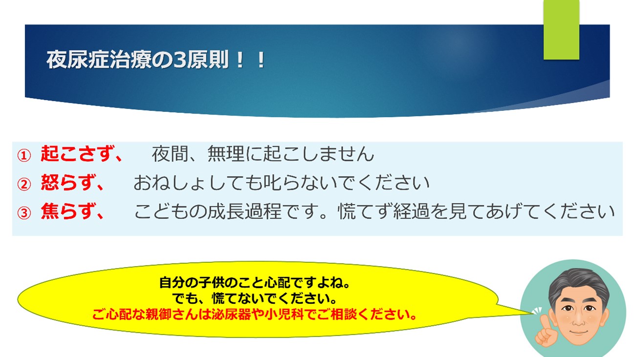 夜尿症治療の3原則として、①起こさず、②怒らず、③焦らずといった言葉があります。