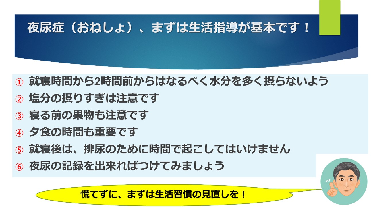 よって、就寝時間から2時間前からはなるべく水分を多く摂らないようにすることが重要です。(ただし、最近はだいぶ暑い日もありますので汗をかくときは適宜必要な水分を摂取してください。)