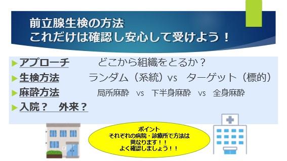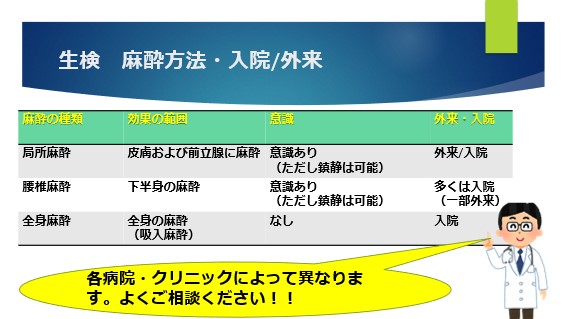 例えば、経直腸アプローチによる生検では、麻酔は局所麻酔で行うことが大半ですが、経会陰アプローチによる生検では、皮膚から針を刺すため、ある程度しっかりとした麻酔が必要となり腰椎麻酔(下半身の麻酔、意識はあります)などで行われることが多いです。
