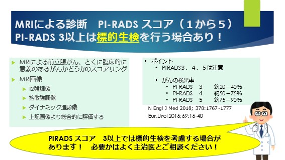 MRI検査では、PI-RADSスコア(Eur.Urol 2016;69:16-40)という前立腺の評価基準があります。
